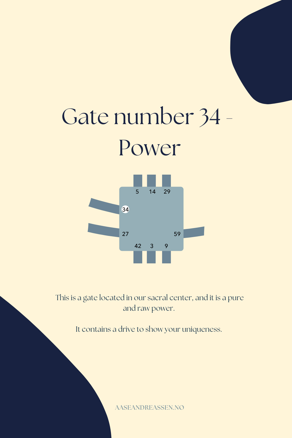 This is a gate located in our sacral center, and it is a pure and raw power. It contains a drive to show your uniqueness.